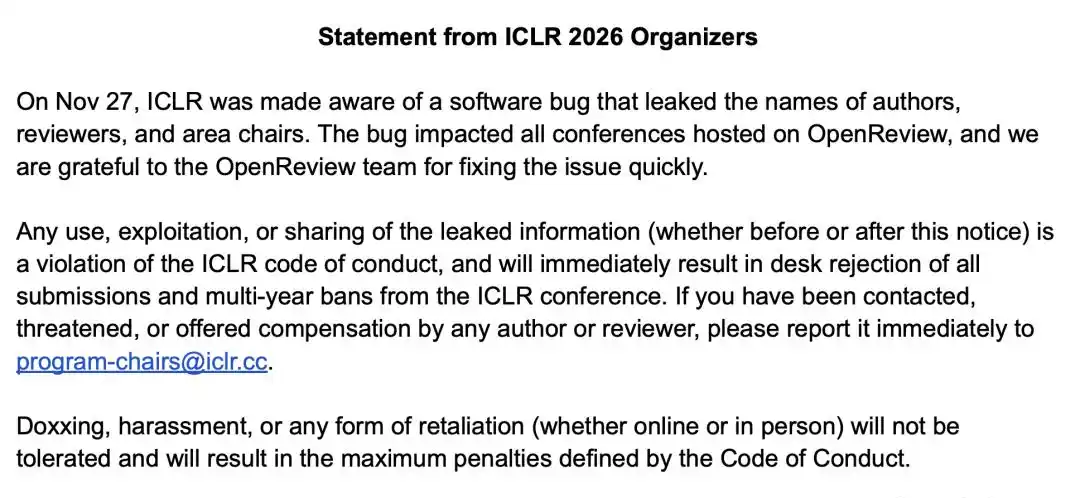 表示任何使用、暴露或分享泄露信息的人员将会被禁入ICLR,且未来可能采取进一步行动。虽然事件的处理已经开始。