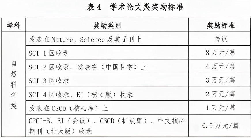 最近爆料的某高校: 针对自然科学类论文,SCI一区奖励8万元/篇,二区4万元/篇,三区3万元/篇,四区1万元/篇。